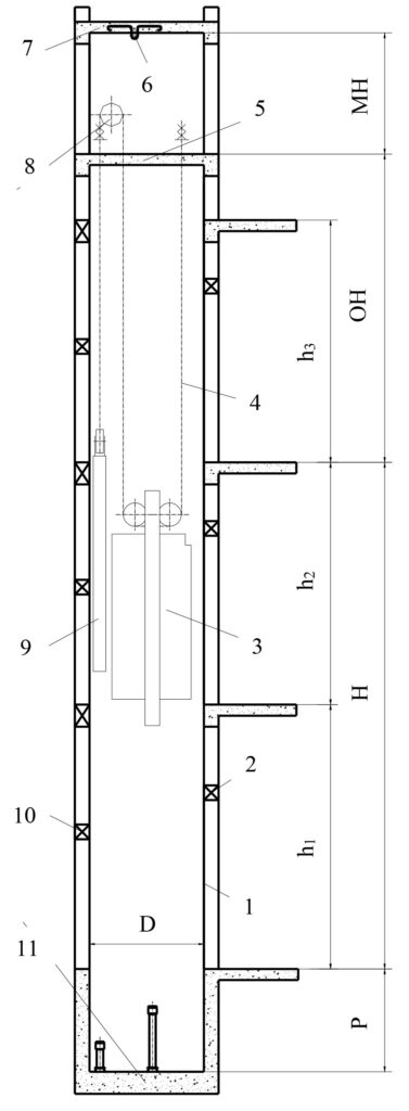 Giếng thang ở hình 2 là loại giếng thang khung bê tông gạch xây chèn, lắp loại thang máy điện, dẫn động cáp, có buồng máy đặt ngay trên giếng thang, đối trọng đặt phía sau cabin.